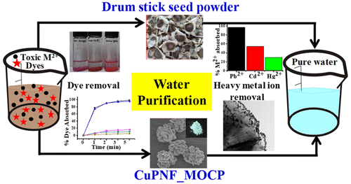 Seed powder of vegetable drum stick (Moringa oleifera) is a household known material for the coagulation of impurities from water. We find from our lab experiments that this material indeed removes toxic inorganic heavy metal ions and organic dyes; however, the latter can be degraded in the presence of H2O2 under Cu2+ as catalyst. To understand the details of the treatment of water that is taking place by this seed powder, a simple inorganic–protein nanoflower system was developed using copper phosphate (CuP), and a low molecular weight, cationic, and coagulant protein of Moringa oleifera (MOCP), to result in the nanoflowers (NFs), CuPNF_MOCP. The CuPNF_MOCPs were synthesized at different ratios of inorganic versus protein components and characterized by spectroscopy and microscopy techniques. Both the time- and the protein concentration-dependent flower growth showed complete flower morphology within 24 h with tightly packed petals having smooth surface upon increasing the protein concentration as noticed from SEM. The anionic dyes were adsorbed more preferentially over the cationic ones by these NFs, due to the cationic charge present on MOCP, as understood by studying six different dyes of which three are anionic and three are cationic in nature. The dyes are oxidatively degraded by a Fenton-type mechanism that takes place between Cu2+ present in the NFs and added H2O2 with the generation of •OH radicals. These NFs also adsorb heavy metal ions, such as Pb2+, Cd2+, and Hg2+, with high selectivity of >99% for Pb2+. Upon adsorption of Pb2+, the surface of the NFs revealed needle-shaped structures at petal edges in their micrographs, where the needles were confirmed by elemental mapping, powder XRD, and energy dispersive X-ray spectroscopy. Thus, the water purification routinely carried out by the households using the drum stick seed powder is essentially due to the coagulant protein present in it. This has been demonstrated in the form of CuPNF_MOCP for scavenging toxic heavy metal ions and organic dyes from water sources. Hence, this study provides a lead for the purification of water in a sustainable manner.