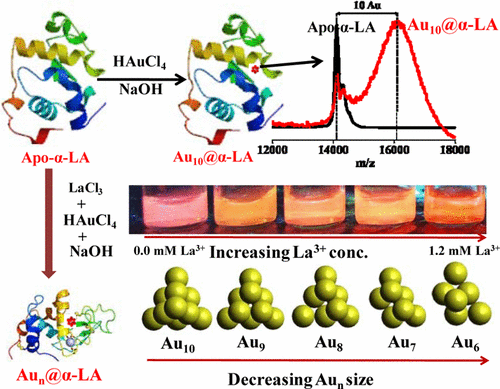 In this paper, we report the studies relevant to controlling the size of protein-protected gold nanoclusters (AuNCs). In order to demonstrate this, we have chosen bovine apo α-Lactalbumin (apo-α-LA), which has a specific binding site for Ca2+, and La3+ occupies this position when apo-α-LA is treated with lanthanum trichloride. When the Apo-α-LA is treated with Au3+, it results in the formation of a protein-coated Au10 nanocluster where the protein reduces Au3+ to Au0 and protects the nanoclusters (apo-α-LA-AuNCs) which are luminescent. In these protein-protected luminescent gold nanoclusters, the protein is involved both in reduction as well as protection, thereby supporting green synthesis. As La3+ occupies the Ca2+ site in apo-α-LA, the size of AuNCs formed is reduced to smaller than the Au10, where the size is dependent on the extent to which La3+ is bound to the protein with a concomitant increase in luminescence. The apo-α-LA-AuNCs and the same formed in the presence of different concentrations of La3+-bound protein were all characterized by analytical, spectral, and microscopy techniques. Control of the size of AuNCs formed was also studied by using Gd3+ instead of La3+ and found similar results. In particular, the size variation of AuNCs was clearly demonstrated by MALDI-TOF-MS and HRTEM. Thus, the apo-α-LA protein-coated gold nanocluster is a useful green material for suitable applications. Go to article |
