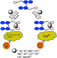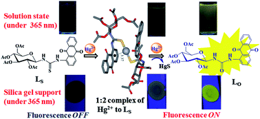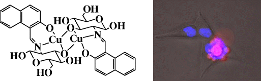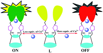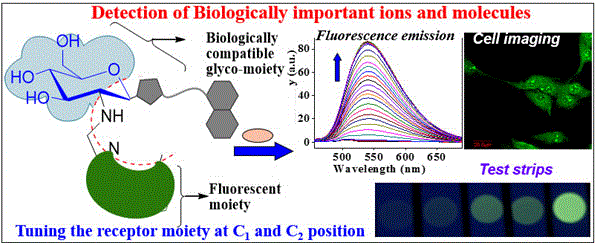 A coumarine–imino–C2-glucosyl conjugate (L) was synthesized and characterized. The conjugate L is found to recognize Cu2+ in aqueous HEPES buffer by exhibiting a 95% fluorescence quenching in pH range 7–10 even in the presence of several biologically and ecologically relevant metal ions. Fluorescence on–off behavior has been clearly demonstrated on the basis of the binding variability of Cu2+ to L. The binding has been elicited through the changes observed in fluorescence, absorption, ESI-MS and 1H NMR titrations. All the other thirteen metal ions studied did not show any change in the fluorescence emission. These ions do not interfere with the recognition of Cu2+ by L. The structural features of [CuL]2 complex in both the isomeric forms were established by DFT computational calculations. The utility of L has been demonstrated by showing its sensitivity toward Cu2+ on a thin layer of silica gel. The L gives sensitive fluorescence signals for Cu2+ even in blood serum and exhibits appropriate fluorescence responses in living cells.
