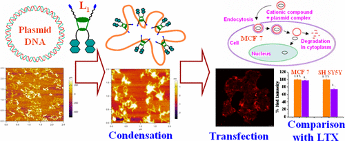A new bimodal fluorescent cationic calix[4]arene (L1) conjugate has been synthesized in multiple steps and well characterized by NMR and electrospray ionization–mass spectrometry (ESI–MS) techniques. L1 has been investigated for its DNA binding ability by various spectroscopy techniques like absorption, fluorescence, and circular dichroism (CD). The formation of L1–DNA complex has been confirmed by the gel electrophoresis in the presence of incremental concentration of L1. To visualize the packing of the plasmid (pBR322), detailed tapping mode atomic force microscopy study has been performed, which revealed blob-like structure of plasmid upon addition of the incremental amount of L1. Concentration dependent transfection ability of L1 has been established in MCF-7 cells by confocal microscopy by carrying the red fluorescent protein (RFP) encoded plasmid pCMV-tdTomato-N1 to emit both intrinsic fluorescence of L1 as well as that from RFP. All this has been possible in the absence of any adjuvant phospholipids (DOPE) that are commonly used as helper. Further transfection efficiency of L1 has been compared with the commercially available lipofectamine (LTX) in two cancer cell lines, MCF 7 and SH-SY5Y, and found that the L1 is as efficient as that of LTX. Hence, L1 is an efficient and effective cargo to transport genetic material into the cells. Go to article |