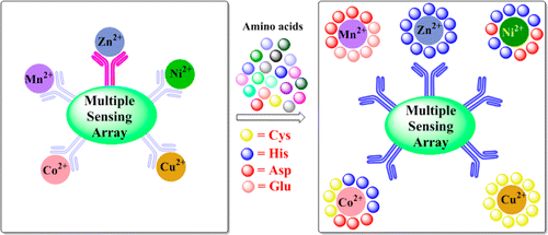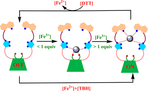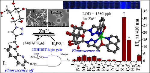 A water-soluble triazole-linked quinoline conjugate of glucopyranose (L) has been synthesized and characterized, and its single-crystal X-ray diffraction (XRD) structure has been established. Binding of L toward different biologically relevant metal ions has been studied using fluorescence and absorption spectroscopy in HEPES buffer at pH 7.4. The conjugate L detects Zn2+ and Cd2+ with 30 ± 2 and 14 ± 1-fold fluorescence enhancement, respectively, but in the case of Hg2+, only a fluorescence quench was observed. The stoichiometry of the complex is 1:2 metal ion to the ligand in the case of Zn2+ and Cd2+ resulting in [Zn(L)2] and [Cd(L)2], and it is 1:1 in the case of Hg2+, as confirmed from their electrospray ionization mass spectrometry (ESIMS) spectra. Zn2+ shows greater exothermicity over Cd2+, whereas Hg2+ shows endothermicity , which supports the differences in their binding strength and the nature of the corresponding complex. L exhibits rod-shaped particles and upon complexation with Zn2+, it exhibits sphere-like morphological features in scanning electron microscopy (SEM) images. However, clustered aggregates are observed in Cd2+, whereas the [HgL] complex exhibits small fused spherical structures, and therefore the signature of these ions is seen in microscopy images. The computational studies revealed that the syn-[Zn(L)2] complex is stabilized by 9.7 kcal mol–1 more than that in the case of anti-[Zn(L)2] owing to the formation of hydrogen bonds between the two glucosyl moieties within the syn-complex. Among the anions studied, [Zn(L)2] is sensitive and selective toward the phosphate ion (H2PO4–) with a minimum detection limit of 16 ± 2 ppb. Similarly, the [HgL] can act as a secondary sensor for CN– while also exhibiting reversibility. Based on the input–output characteristics, INHIBIT logic gate was built in the case of Zn2+ vs H2PO4– and IMPLICATION logic gate was built in the case of Hg2+ vs CN–. Go to article |