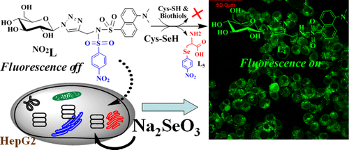 A dansyl derivatized triazole linked glucopyranosyl conjugate (NO2L) has been synthesized and characterized and was used in the present study. The conjugate NO2L releases a fluorescent product upon reaction by Cys-SeH in aqueous PBS buffer by exhibiting a ∼210-fold fluorescence enhancement even in the presence of 20 other amino acids with a minimum detection limit of (1.5 ± 0.2) × 10–7 M. The selectivity of the Cys-SeH to NO2L was further proven by extending the fluorescence study to different other selenium compounds. The role of para-nitrobenzenesulfonyl (pNBS) center in NO2L in the selective recognition of Cys-SeH was confirmed when the fluorescence emission studies were carried out using five different derivatizations possessing two NO2, five fluoro, two fluoro, one fluoro, and no fluoro groups. The nucleophilic substitution reaction of Cys-SeH on NO2L has been clearly demonstrated on the basis of 1H NMR, ESI-MS, and absorption spectroscopy, and the heat changes were monitored by isothermal titration calorimetry. The application potential of NO2L has been demonstrated by studying its selectivity toward Cys-SeH in aqueous PBS buffer, in bovine serum, and on the silica gel surface that lead to minimum detection limits of (25 ± 2), (80 ± 5), and (168 ± 16) ppb, respectively. The biological applicability of NO2L for Cys-SeH was further demonstrated in HepG2 cells by fluorescence microscopy. Thus, NO2L is aqueous soluble and a biologically acceptable probe for Cys-SeH. Go to article |