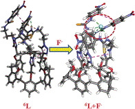 Anion recognition studies were performed with triazole-appended thiourea conjugates of calix[6]arene (i.e., compound 6L) by absorption and 1H NMR spectroscopy by using nineteen different anions. The composition of the species of recognition was derived from ESI mass spectrometry. The absorption spectra of compound 6L showed a new band at λ=455 nm in the presence of F− due to a charge transfer from the anion to the thiourea moiety and the absorbance increases almost linearly in the concentration range 5 to 200 μm. This is associated with a strong visual color change of the solution. Other anions, such as H2PO4− and HSO4−, exhibit a redshift of the λ=345 nm band and the spectral changes are associated with the formation of an isosbestic point at λ=343 nm. 1H NMR studies further confirm the binding of F− efficiently to the thiourea group among the halides by shifting the thiourea proton signals downfield followed by their disappearance after the addition of more than one equivalent of F−. The other anions also showed interactions with compound 6L, however, their binding strength follows the order F−>CO32−>H2PO4−≈CH3COO−>HSO4−. The NMR spectral changes clearly revealed the anion-binding region of the arms in case of all these anions. The anion binding to compound 6L indeed stabilizes a flattened-cone conformation as deduced based on the calix-aromatic proton signals and was further confirmed by VT 1H NMR experiments. The stabilization of the flattened-cone conformation was further augmented by the interaction of the butyl moiety of the nBu4N+ counterion. The structural features of the anion-bound species were demonstrated by DFT computations and the resultant structures carried the features that were predicted based on the 1H NMR spectroscopic measurements. In addition, SEM images showed a marigold flower-type morphology for compound 6L and this has been transformed into a chain-like structure of connected spherical particles in the presence of F−. The anion-induced microstructural features are reflective of the binding strength, size, and shape of the anions. The binding strengths of the anions by compound 6L were further compared with that of compound 4L, a calix[4]arene analogue of compound 6L, in order to address the role of the number of arms built on the calixarene platform based on absorption spectroscopy, 1H NMR spectroscopy, and DFT computations and it was found that compound 6L is a better receptor for F−, which extends its interactions from all the three arms.