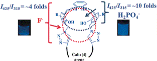 A triazole-linked hydroxyethylimino conjugate of calix[4]arene (L) and its cadmium complex have been synthesized and characterized, and their structures have been established. In the complex, both the Cd2+ centers are bound by an N2O4 core, and one of it is a distorted octahedral, whereas the other is a trigonal anti-prism. The fluorescence intensity of the di-nuclear Cd(II) complex is quenched only in the presence of phosphates and not with other anions studied owing to their binding affinities and the nature of the interaction of the phosphates with Cd2+. These are evident even from their absorption spectra. Different phosphates exhibit changes in both their fluorescence as well as absorption spectra to varying extents, suggesting their differential interactions. Among the six phosphates, H2PO4- has higher fluorescence quenching even at low equivalents of this ion, whereas P2O74- shows only 50% quenching even at 10 equivalents. The fluorescence quenching is considerable even at 20 ppb (0.2 µM) of H2PO4-, whereas all other phosphates require a concentration of 50–580 ppb to exhibit the same effect on fluorescence spectra. Thus, the interaction of H2PO4- is more effective by ~30 fold as compared to that of P2O74-. Fluorescence quenching by phosphate is due to the release of L from its original cadmium complex via the formation of a ternary species followed by the capture of Cd2+ by the phosphate, as delineated based on the combination of spectral techniques, such as absorption, emission, 1H NMR and ESI MS. The relative interactive abilities of the six phosphates differ from each other. The removal of Cd2+ is demonstrated to be reversible by the repeated addition of the phosphate followed by Cd2+. The characteristics of the ternary species formed in each of these six phosphates have been computationally modeled using molecular mechanics. The computational study revealed that the coordination between cadmium and –CH2–CH2–OH breaks and new coordination is established through the phosphate oxygens, and as a result the Cd2+ center acquires a distorted octahedral geometry. The utility of the complex was demonstrated in HeLa cells.