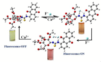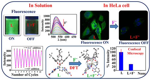 p-tert-Butyl-calix[4]arene was derivatized by integrating a benzooxadiazole fluorescent tag into its 1,3-arms at the lower rim to result in L and was characterized. L was titrated with 17 anions in THF and found selective for F– ions with lowest detection limit of 109 ppb. L and F– form a 1:1 complex. L self-assembles in THF to result in sheet like structures which converts into smaller spherical particles upon addition of F–. The site of interaction of F– was deduced based on 1H NMR spectroscopy and the coordination features by density functional theory (DFT) computations wherein six noncovalent interactions of the type X–H···F (where X = O, N, or C) were noticed. The sensing of F– is reversible when titrated with Ca2+, and the reversibility was demonstrated for 10 cycles without losing sensitivity. The study has been extended to the biological cells using fluorescence and confocal microscopy. While L shows strong fluorescence in HeLa cells, increasing concentrations of F– exhibited greater fluorescence quenching. Thus, L acts as a good sensor for F– in solution as well as in biological cells, a rare and unique combination for a calixarene conjugate to exhibit such sensing behavior in dual media.