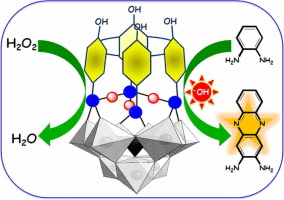 The inorganic-organic hybrid based on covalently attached trilacunary phosphotungstate and calixarene conjugate (POM-Calix hybrid) has been synthesized via facile click chemistry approach. The characterization studies showed that both the moieties are present together in the hybrid upon covalent modification. The morphology of the hybrid was studied by SEM, TEM and AFM analyses suggesting spherical shaped nanoparticles of 40–60 nm size for the hybrid. The POM-Calix hybrid was successfully employed to demonstrate peroxidase-like activity for the oxidation of the model substrate, viz., o-phenylenediamine (OPD), for the enzyme. The activity of the POM-Calix hybrid was ∼170% greater than that exhibited by simple POM and this is mainly attributed to the introduction of hydrophobic character by the covalently attached calixarene conjugate and the hydrophobicity is supported by the contact angle measurement. From the kinetic studies, the Michaelis constants, Km and Vmax were estimated to be 2.55 mM and 0.756 × 10−8 M s−1, respectively. It was observed that, the POM-Calix hybrid facilitates the formation of OH radicals when treated with H2O2 which eventually results in the oxidation of the substrate. The POM-Calix hybrid exhibits excellent enzyme-like activity over a wide pH range, which would enable its bio-applications at physiological conditions.