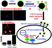 Lectins are known for their specificity for carbohydrate binding. However, a few specific carbohydrate residues are over expressed in cancer cells, which may be an advantage for using a lectin that is specific to such residues. Herein, we report the strategic design of wheat germ agglutinin (WGA) and a fluorescent torch, FITC immobilized on Fe3O4 NPs as a cell membrane specific receptor target for breast cancer cells, viz., MCF-7 and MDA-MB-231. The resultant nanocomplexes were well characterized by using microscopy and spectroscopy. The WGA tagged nanocomplex was further loaded with the anticancer drug 5-fluorouracil (5-FU) to selectively kill the cancer cells. The loading efficiency of 5-FU is ∼356 μg mg−1. The nanocomplex itself shows ∼90% cell viability for all the four cell lines (HEK, HeLa, MCF-7 and MDA-MB-231) studied and is therefore a suitable targeting drug delivery vehicle. However, the nanocomplex loaded with {WGA + 5-FU} shows a ∼1.5-fold decrease in cell viability in the case of specific cells (MCF-7 and MDA-MB-231) when compared to non-specific cells (HeLa and HEK). The internalization of the nanocomplex is supported by fluorescence microscopy and confocal laser scanning microscopy techniques by tracking with the fluorescent torch, FITC. The nanocomplex can be internalized ∼2 times more in the specific cells as compared to the non-specific cells. It is observed that the internalization is ∼2 fold increased when the MDA-MB-231 cells are exposed to a magnetic field for 24 h as compared to in the absence of a magnetic field. Live–dead cell assay of the 5-FU loaded nanocomplex was done by propidium iodide (PI) staining. There is an increase in the cell death by ∼2.5 fold when the cells are under a magnetic field as measured from the PI uptake. Such strategic designing of the nanocomplex can lead to the development of a better method to selectively target and kill the cancer cells by acting as a carrier to deliver a suitable drug, as a result of which the medical field can benefit.