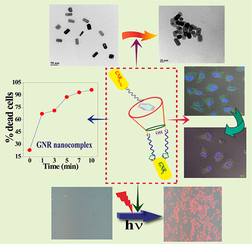A new 1,3-lower rim-lipoic acid appended calix[4]arene (L) has been synthesized and characterized by different spectral techniques. Lipoic acid functionality helps L to anchor onto a noble metal surface, and in the present case these are the gold nanorods (GNRs). As the conjugate of calix[4]arene acts as a host due to the presence of its arene cavity, pyridinium containing guests have been explored to study their complexation, since the pyridinium containing molecules will accumulate in mitochondria in cells. The host–guest complexation has been explored in solution by 1H NMR, ESI-MS, UV–vis, and fluorescence spectral titration studies. The loading of host and the guest onto the GNR surface has been analyzed by spectroscopy and microscopy and found that their combination results in nanocomplexation. The presence of pyridinium functionality on the guest leads to targeted delivery to mitochondria of GNR nanocomposites as shown by confocal laser scanning microscopy imaging. The nanocomplex has been studied for cancer cell imaging and laser-induced cell killing with the help of plasmonic gold nanorods. When excited at the longitudinal SPR band of GNRs using laser (λ = 633 nm), cancer cell killing was observed due to laser-induced cell death. The flow cytometry studies supported ∼97% killing when the GNR-nanocomplex administered HeLa cells were irradiated under laser light for 10 min, which is a ∼4 fold increase in their cell as compared to the study carried out in the absence of laser light irradiation, and this has been partly attributed to the greater internalization of these into cells.