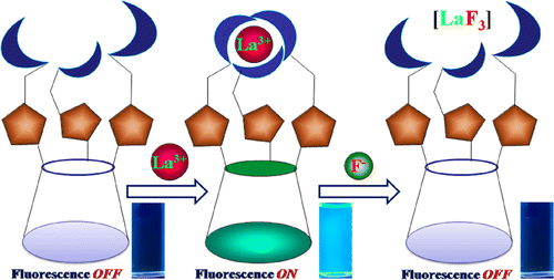 A nitrobenzoxadiazole (NBD)-appended calix[4]- arene conjugate (L) possessing a cyclic core formed by connecting the 1,3-positions at the lower rim has been designed. The L has been developed as a receptor for the selective recognition of biologically and ecologically relevant trivalent metal ions, viz., Cr3+, Fe3+, and Al3+. The interaction and region of binding of these metal ions by the receptor L have been explored by isothermal titration calorimetry, spectroscopy, microscopy, and density functional theory (DFT) computational studies. The probe L itself exhibits weak fluorescence emission intensity, and the quantum yield is enhanced by ∼4-fold upon addition of the M3+ ion due to the chelate enhanced fluorescence effect. Fluorescence enhancement also takes place in L when it interacts with M3+ even in the solid state and in the MCF7 cancer cells. The binding constant (Kb) for M3+ by L is ∼104 M−1, supporting that these ions bind to L with moderate strength. The detection limit for all the three metal ions is as low as 4−5 μM. The 1H NMR data reflects the region of binding of the M3+ ion to L. The binding is further supported by DFT studies where the space filling structures evidently shows the binding core in L, and the M3+ ion is buried in this core. As a result of this, the microscopy features are almost the same for L and {L + M3+}. The reversible utility of the sensor has been achieved by the addition of H2PO4−. Based on the input−output information, a molecular logic circuit (INHIBIT logic gate) has been built,which will provide an electronic basis for designing a memory device by the concerned experts.