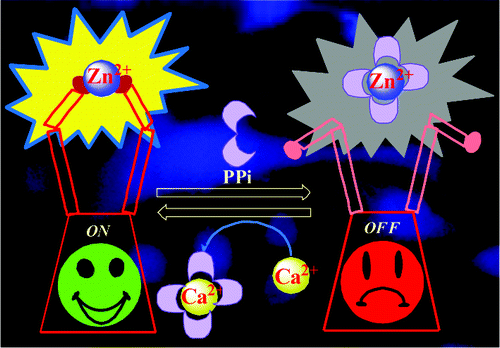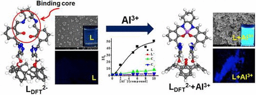 A phenylene diimine capped conjugate of 1,3-calix[4]arene (L) was synthesized and characterized, and its Mg2+ complex has been isolated and characterized. The chemo sensing ensemble of Mg2+ bound L provides distinguishable features of response toward phosphates, viz., HPO42–, P2O74–, and AMP2– (Set A) and H2PO4–, ATP2–, and ADP2– (Set B). While the Set A shows the formation of ternary complex, the Set B does not exhibit any intermediate complex, but both show the release of Mg2+ and L at different equivalents. The structures of {L + Mg2+} and its phosphate bound ternary complexes have been established by computational calculations, and the corresponding results agree well with the experimental ones. The microscopy studies show an aggregation–disaggregation phenomenon in the presence of different equivalents of phosphates in both of the sets. Using the fluorescence data, an INHIBIT logic gate has been built. Go to article |
