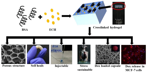 Hydrogels have been used in the literature in tissue engineering, in drug delivery, and as enzyme biomimics. Herein, we report the synthesis of a functional biomaterial using BSA as scaffold and epichlorohydrin as cross-linker. The hydrogels reported in this paper were shown to exhibit tunable pore size as a function of BSA concentration by scanning electron microscopy (SEM) and, therefore, are well suited to encapsulate drug molecules for delivery applications. These are injectable, shear thinning, self-healing, and has the ability to withstand a physical weight of ∼300 times of its own. In trypsin medium, the gel is degraded by 50% in 36 h supporting that these are biodegradable. The loading of Dox by the gel was confirmed by the emission of red fluorescence and also by filling the pores by fibrillar structures as demonstrated by SEM. The controlled release of Dox occurs over 5 days to an extent of 37 ± 2%, 26 ± 0.5%, and 21 ± 1.5% in PBS at pH 5.5, 6.8, and 7.4 respectively. Since these hydrogels are made of BSA as matrix, their biocompatibility was proven by MCF-7, HeLa, and MDA-MB-231 cells wherein 95 ± 5% of cells are viable when treated with unloaded hydrogel. However, the Dox loaded hydrogel results in 70–80% of killing in the case of all three cancer cells. Fluorescence microscopy and FACS studies support controlled and time dependent release of Dox in MCF-7 cells for 24 h where the drug goes into cytoplasm initially and then into nucleus. The cell cycle analysis carried out using MCF-7 cells clearly showed that the cell death is due to apoptosis, and this is by arresting the G2/M phase as a function of time. All of the data supports the utility of the synthesized BSA hydrogel as a biomaterial that will find application in controlled drug delivery.