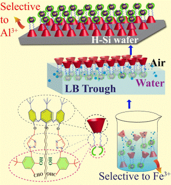 A triazole appended benzaldehydic lower rim derivative of calix[4]arene (L) has been synthesized and was thoroughly characterized. In CH3CN solution, the L showed greater sensitivity for Fe3+ by a 5‐fold increase in the absorbance and 37% quenching in the fluorescence intensity, by forming a 1:1 complex. The Fe3+ induces aggregation in L as studied by microscopy. The Langmuir film formed at the air‐water interface was characterized by pressure‐area isotherm and Brewster angle micrographs, both in the presence and absence of metal ions. The Langmuir films of pure L, {L+Al3+} and {L+Zn2+} were transferred onto H‐terminated Si‐wafer and characterized using Atomic Force Microscopy, contact angle, Grazing Incidence Fourier Transform Infrared Spectrscopy and X‐ray Photoelectron Spectroscopy. The study resulted selective binding of Al3+ to the Langmuir film of L among the nine metal ions studied. Thus, the calix[4]arene‐conjugate L is sensitive and selective to Fe3+ in acetonitrile solution whereas to Al3+ in Langmuir film and hence acts as an ion switch depending upon the physical state of L.