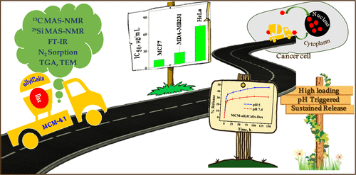 An inorganic–organic hybrid material, MCM-allylCalix, was synthesized by covalent modification of an MCM-41 surface with a tetra-allyl calixarene conjugate. The synthesized hybrid was characterized by 13C and 29Si MAS–NMR, Fourier transform infrared (FT-IR), Brunauer–Emmett–Teller surface area, thermogravimetric analysis (TGA), and transmission electron microscopy (TEM) analyses. The application of this MCM-allylCalix hybrid has been demonstrated for loading and in vitro release of doxorubicin (Dox) in phosphate-buffered saline (PBS) buffer as well as in the cancer cells, viz., MCF7, HeLa, and MDA-MB231. The Dox-loaded hybrid, MCM-allylCalix-Dox, was characterized by TEM, FT-IR, TGA, N2 sorption, diffuse refectance spectroscopy–UV, and fluorescence microscopy to confirm the presence of the drug. The release study of the drug from MCM-allylCalix-Dox was carried out in PBS buffer at pH 5 and 7.4. The results showed ∼140% increase in the release of Dox at pH 5 compared to that at pH 7.4 in 144 h, suggesting a pH-triggered release of the drug. MCM-allylCalix-Dox releases a greater amount of Dox compared to that released from unmodified MCM-Dox. Cytotoxicity studies suggested that MCM-allylCalix-Dox exhibits anticancer activity that is dependent on the nature of the cell. The Dox-loaded hybrid shows more cytotoxicity for MCF7 compared to that for the HeLa and MDA-MB231 cells. This was further supported by ∼120% more internalization of Dox into MCF7 cells compared to that in the other two cell lines. Both fluorescence microscopy and fluorescence-activated cell sorting studies suggested concentration-dependent internalization of Dox into the MCF7 and HeLa cells. The results suggested that the inorganic–organic hybrid can be useful in sustained drug delivery into cancer cells.