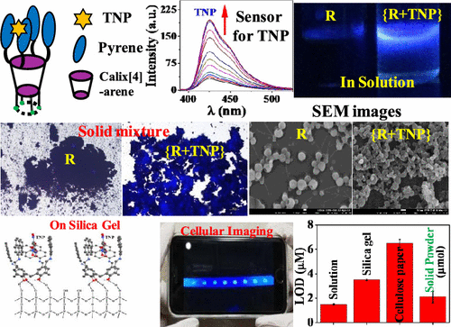 A new fluorescent 1,3-diaminonaphthalimide conjugate of calix[4]arene receptor (R) was synthesized and characterized. The receptor displays good selectivity towards trinitrophenol (TNP) over other explosive aromatic- and aliphatic-nitro compounds by exhibiting changes in its fluorescence emission. Receptor-coated cellulose paper strips are equally effective in terms of their selective detection of TNP over other aromatic- and aliphatic-nitro compounds. When used in solution or on cellulose paper strips, R can detect up to submicromolar concentration of TNP by exhibiting changes in its fluorescence emission and in its supramolecular structure upon interaction. Interestingly, the microscopy features of R, TNP, and {R+TNP} are quite distinct, indicating the interactions present between R and TNP, as studied by using AFM and TEM. Computationally modeled complexes of receptor with TNP and TNT show enormous difference in their interaction energies in the favor of TNP by showing the host–guest interaction of cation···anion type in the presence of TNP but not TNT. This is because the receptor adopts an “arms-open”-type structure in the case of the TNP complex, whereas it adopts an “arms-closed”-type structure in the presence of TNT. Both the experimental and the computational studies reveal that the receptor selectively binds to TNP over TNT. Thus, R-coated Whatman No.1 filter paper strips provide easy, rapid, and economical detection of trace amounts of TNP both by visual and spectral measurement.