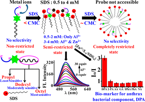 A naphthalimide-basedfluorophore has been conjugated byan octyl chain on one side and an ethylenediamine (“en”) moiety on theother to result in a conjugate (L1) that was adapted to exhibit selective ionsensing. SinceL1is not a receptor for metal ions in water or in organicsolvents, this has been introduced into the self-assembly formed by thesurfactant, i.e., sodium dodecyl sulfate (SDS), and its ion sensing wasstudied by varying the concentration of the SDS since it is known to formpremicellar as well as micellar assemblies. Thus, theL1was successfullyconverted to a specific, selective, and sustainable chemo-receptor system forAl3+and Zn2+with the support of such assemblies of SDS. The selectivitywas among three trivalent and eight divalent ions studied. The ionrecognition ability was dependent on the nature of the assembly of SDSformed and is efficient in the premicellar media. Both the Al3+and Zn2+were differentially recognized just by tuning the SDS concentration. Theresults were ratified by comparing with several control experiments. The excited-state lifetime measurements and the size ofthese assemblies measured by dynamic light scattering (DLS) reveal that at >4 mM SDS concentration (critical micellarconcentration is 8 mM) the probeL1is not accessible for any of the metal ions studied. The two other derivatives possessing ashorter (propyl,L2) and a longer (dodecyl,L3) alkyl chain showed that theL1with an octyl chain performs much better at allthe premicellar SDS concentrations. The Zn2+-bound assembly ofL1in 4 mM SDS was demonstrated for sensing the dipicolinicacid (DPA) which happens to be an endospore component of anthrax bacteria. This study was extended to several othercarboxylic acid derivatives which would act as control molecular systems. Even in the DPA sensing, the assemblies possessing anoctyl derivative stand out when compared to the propyl or the dodecyl derivatives