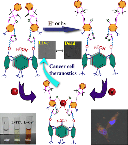 A triazole-derivatized, spiro-indoline-linked, 1,3-di-derivative of calix[4]arene(L) has been synthesized to take advantage of its ion-binding capability in the ring-open form.Indeed, the spiro-indoline moiety is well known for its photochromic, acidochromic, andmetallochromic properties. Therefore, theLhas been explored for Cu2+binding, cell imaging,and anticancer activity of the corresponding complex since Cu2+complexes are known forsuch activity. The conversion from the closed to open form ofLis expedited by light orproton, while the metal ion can open as well as stabilize it. The open form ofLshowedbinding of Cu2+ratiometrically as demonstrated by absorption andfluorescence spectroscopy.This leads to the formation of 1:1 complex with a binding constant of (6.9±2.3)×105M−1,with the lowest detection limit being 1.9 nM. In the complex, the Cu2+is bound by twotriazole-N and two phenolic-O groups resulting in a distorted tetrahedral coordination core ofCuN2O2as demonstrated based on density functional theory studies. To form suchcoordination core, the arms underwent considerable changes in some of the dihedral angles.The binding of Cu2+toLinduces self-assembly ofLby varying from simple particles to rodlike structures when bound to Cu2+.The on−offfluorescence intensity ofLand its Cu2+-bound species are responsible for imaging cancer cells. TheLshows redfluorescence in MDA-MB-231 cancer cells by targeting mitochondria as proved based on the colocalization study carried outusing MitoTracker Green. While theLalone is nontoxic to cancer cells, the presence of Cu2+brings cell death to an extent of90% with an IC50value of 165 nM by bringing a substantial quench in thefluorescence ofL. A shift of population from G0/G1and G2M phases to the Sub-G1phase was observed as the concentration of the complex was increased, indicating cell death asstudied byfluorescence-activated cell sorting. Thus, the present work clearly proved that a calix[4]arene functionalized at thelower rim with spiro-indoline moieities when complexed with Cu2+acts as an efficient anticancer agent and is capable ofimaging cancer cells.